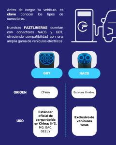 Antes de cargar tu vehículo eléctrico, es fundamental conocer el tipo de conector que utiliza. No todos los cargadores son compatibles con todos los modelos, y elegir el conector adecuado garantiza una carga eficiente y sin contratiempos. Ya sea GBT, o NACS, identificarlo con anticipación te permitirá planificar mejor tus paradas y aprovechar al máximo la infraestructura de carga disponible.
